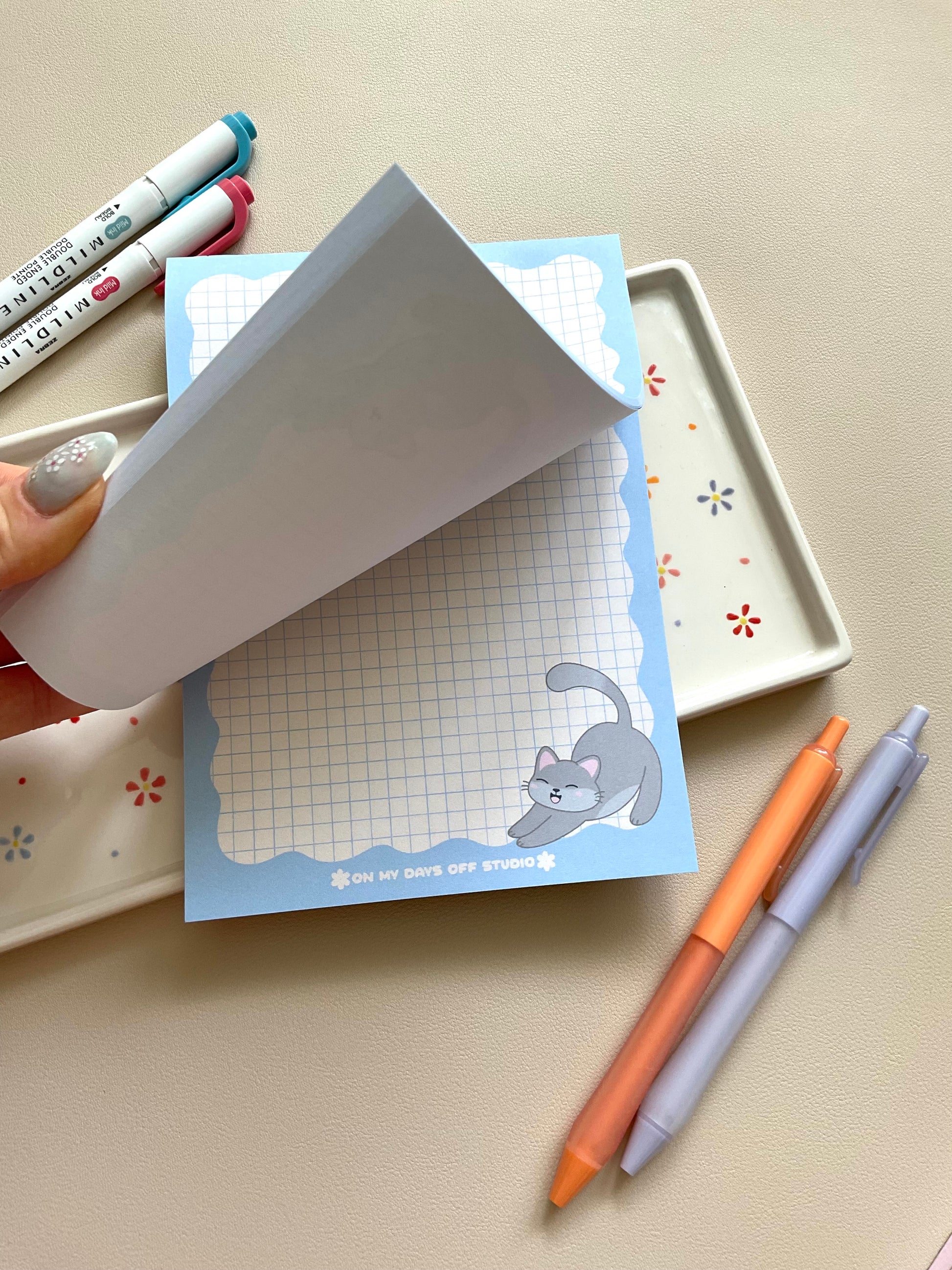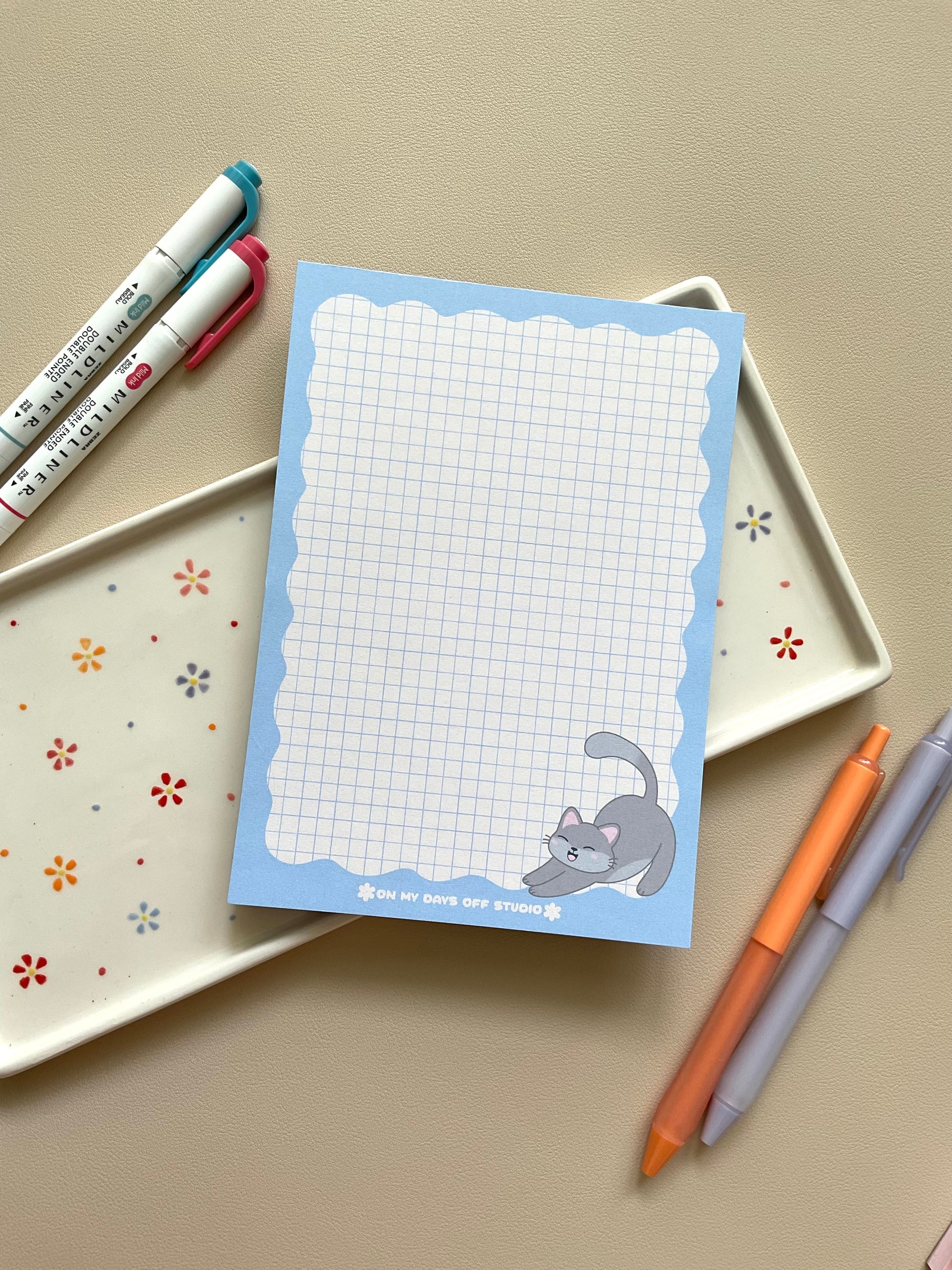 ✿ This cute notepad features an cute grey kitty, grid background & wavy border design. This notepad comes with 50 sheets for your daily reminders and cute to dos.