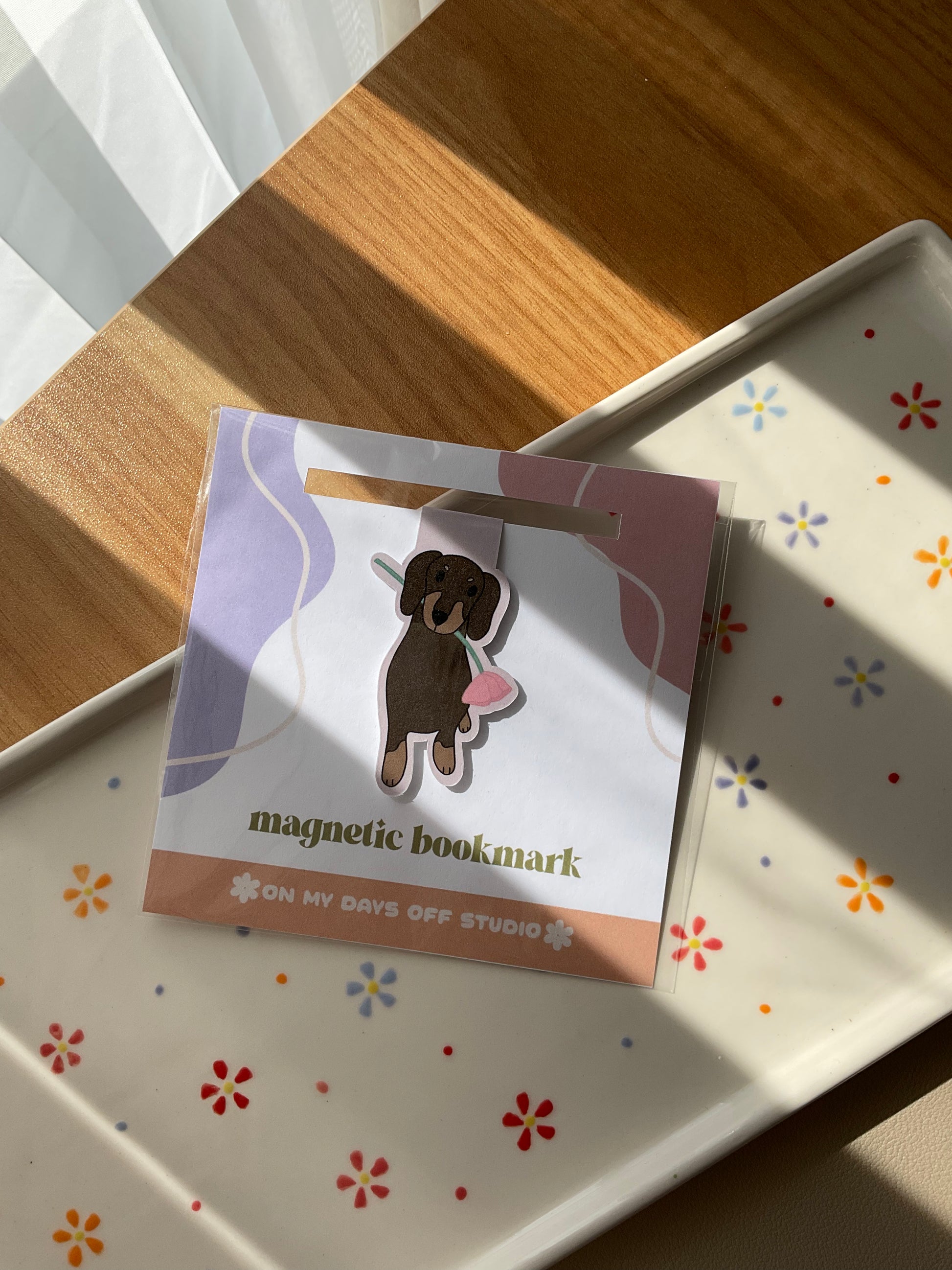 ✿ This cute magnetic bookmark features an cute dachshund holding a flower.