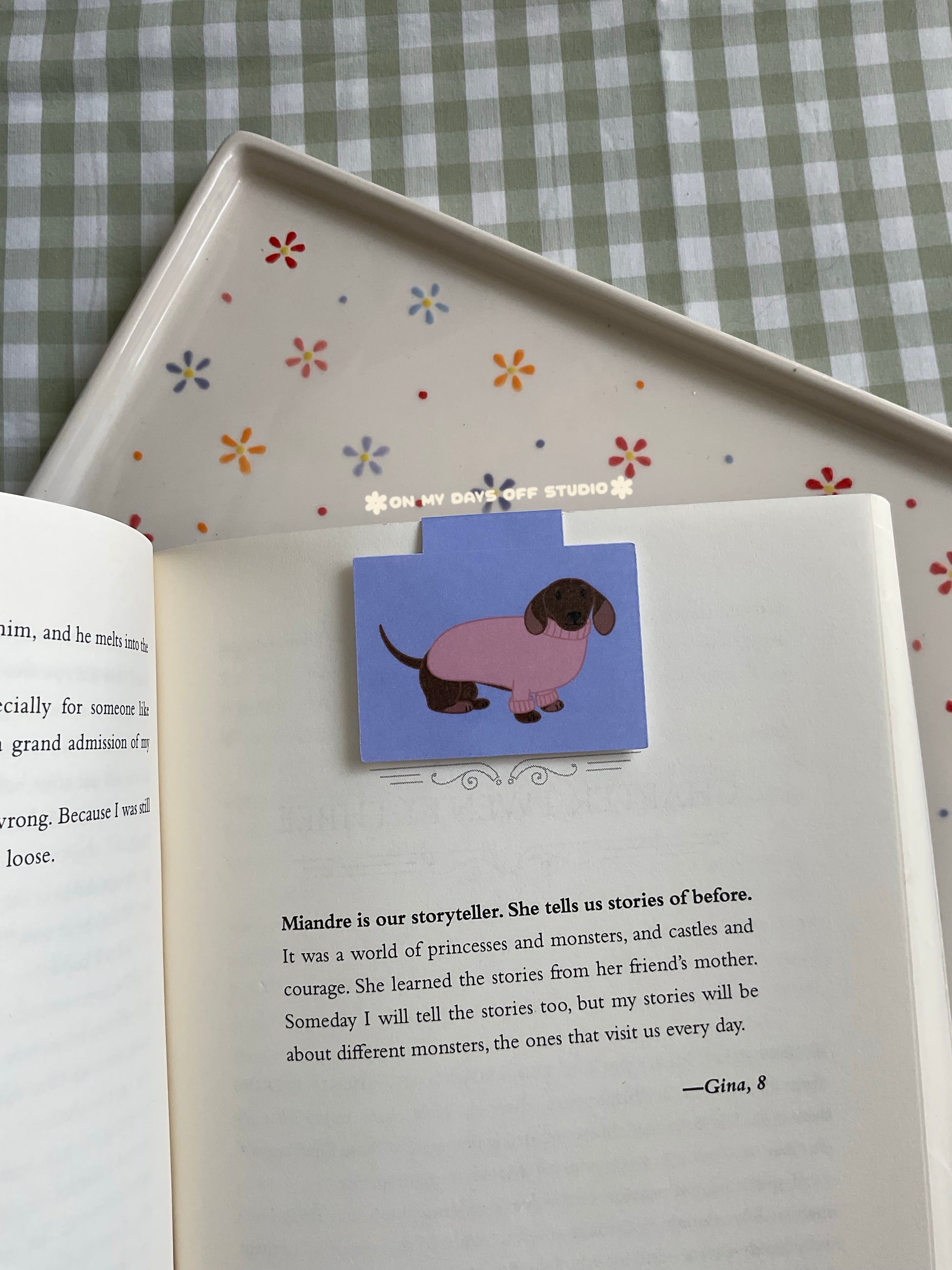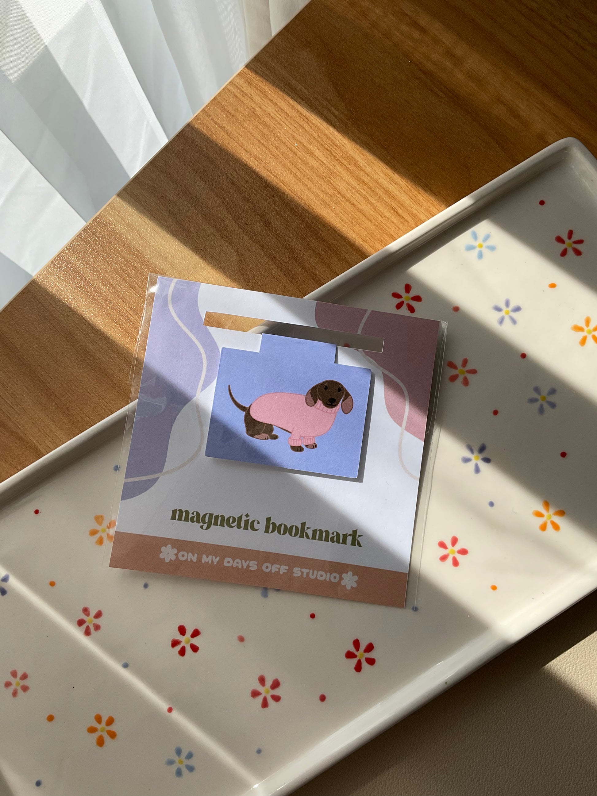 ✿ This cute magnetic bookmark features an cute dachshund wearing a pink sweater.