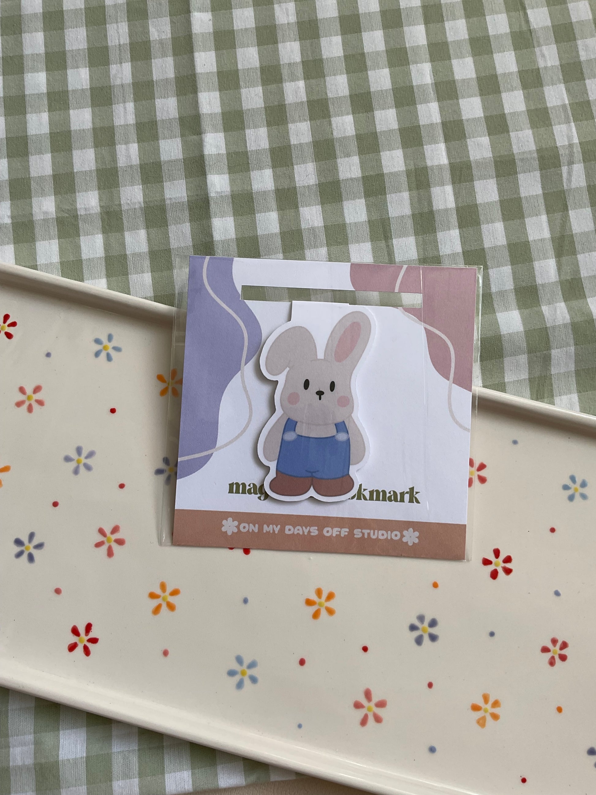 ✿ This cute magnetic bookmark features a cute farmer bunny ready for the day