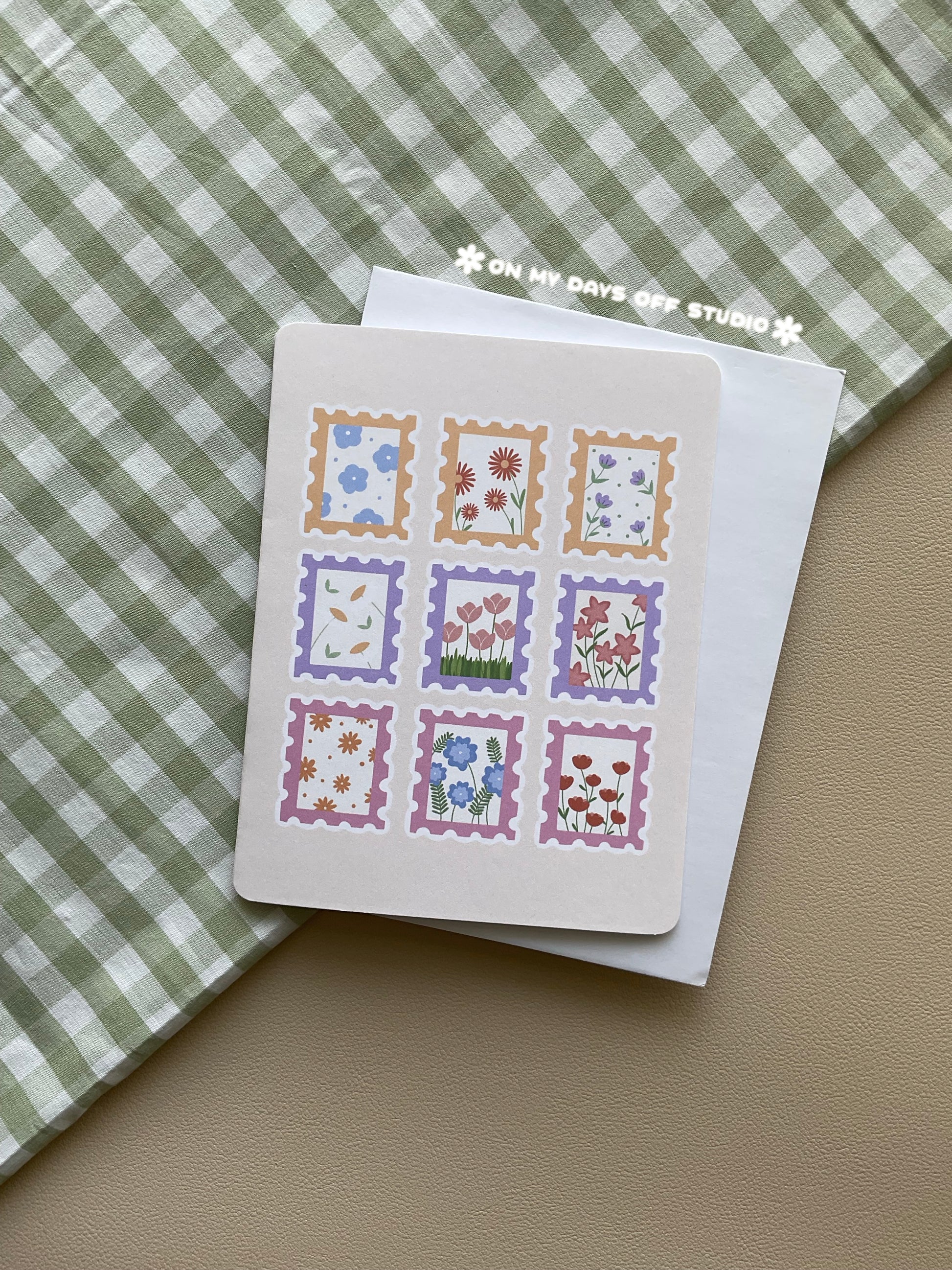 This card has 9 floral illustrations in cute stamps. It's a perfect gift for someone who loves flowers! The inside is blank which leaves plenty of space for you personalized note.