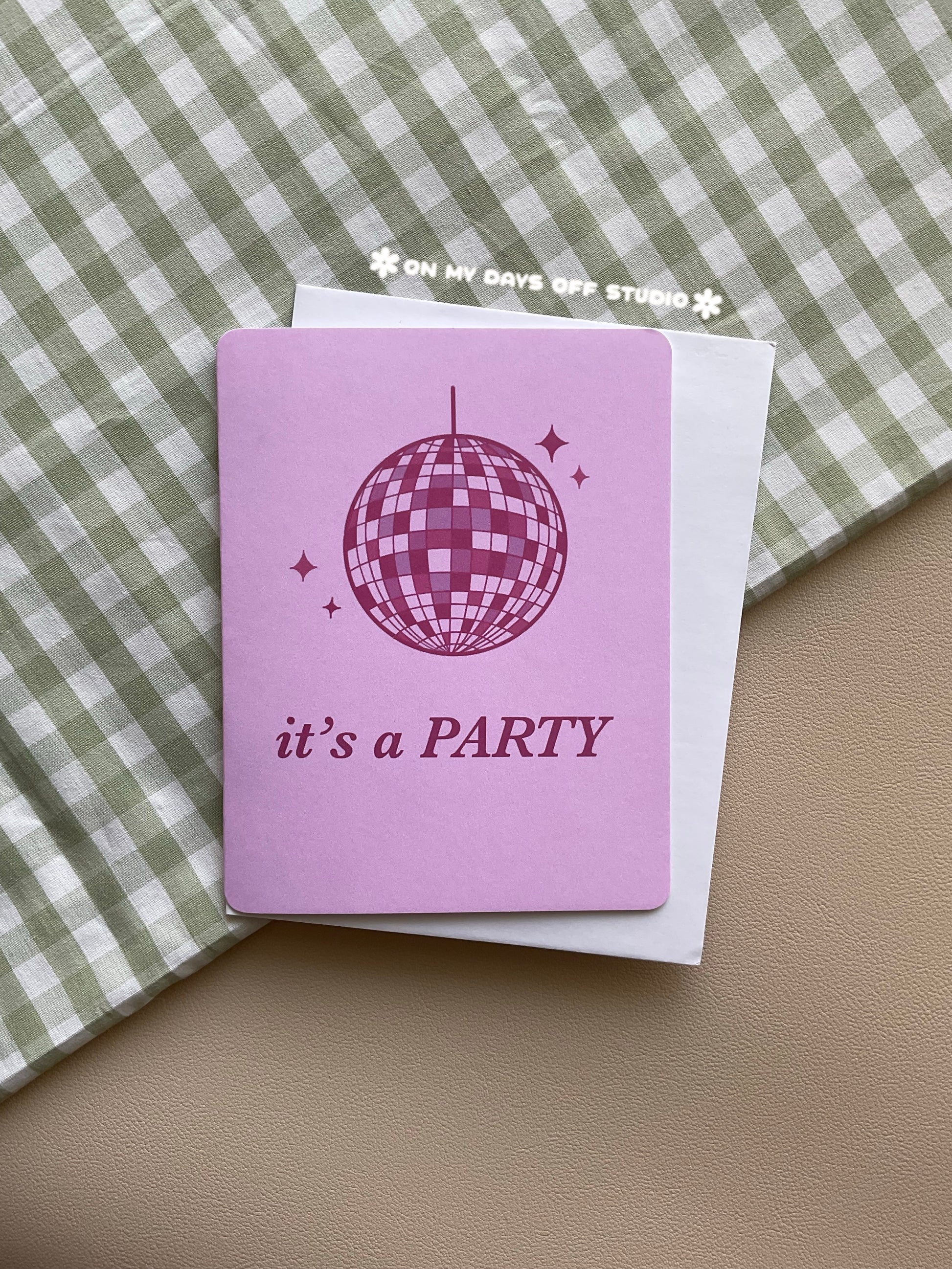 This card has a hot pink disco ball w/ the verbiage "It's Party Time" cover. It's a perfect gift for someone who loves hot pink disco balls, has a birthday coming up or is just plain celebrating something exciting! The inside is blank which leaves plenty of space for you personalized note.