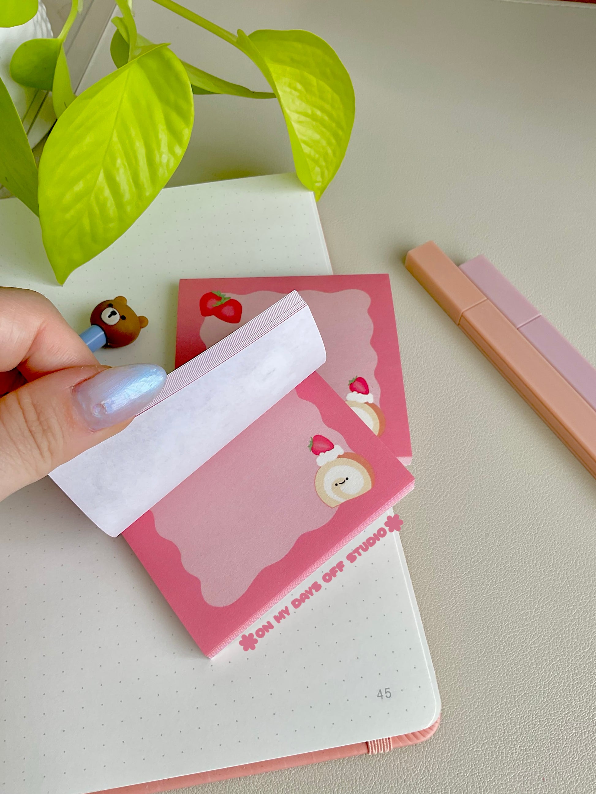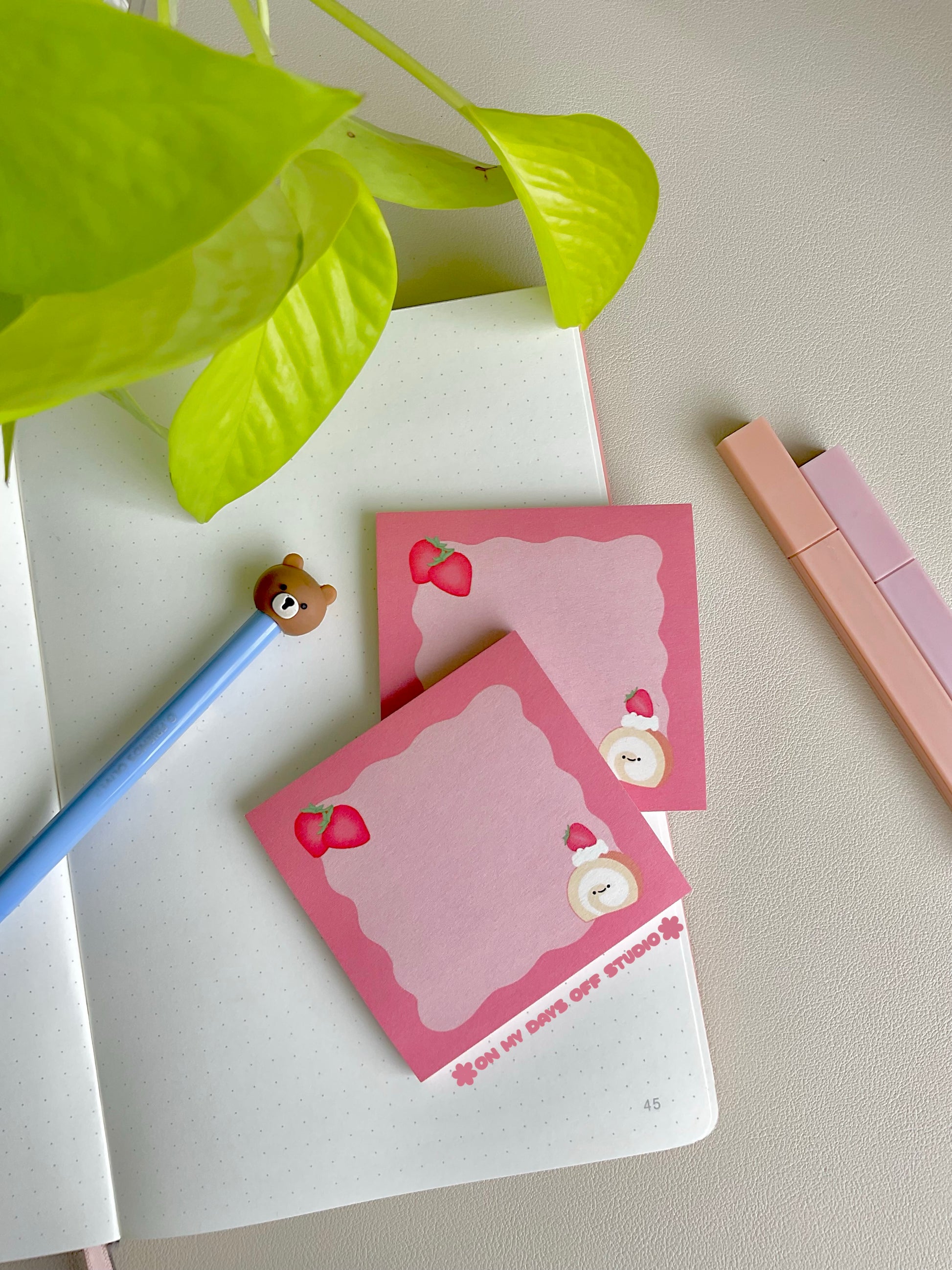 ✿ This cute sticky note pad features an adorable illustration of a strawberry in one corner and a kawaii Japanese cake roll on another. This sticky note comes with 50 sheets for your daily reminders and cute to dos.