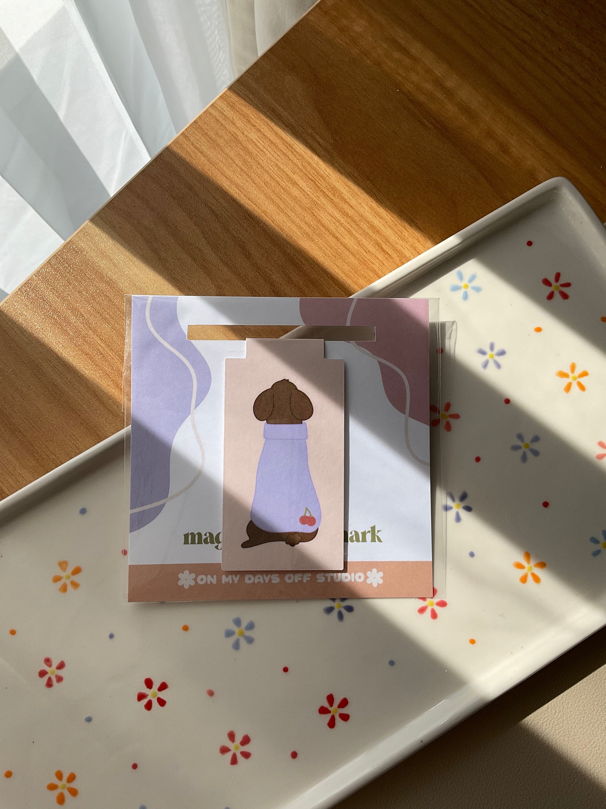 ✿ This cute magnetic bookmark features an cute pup wearing a purple sweater.