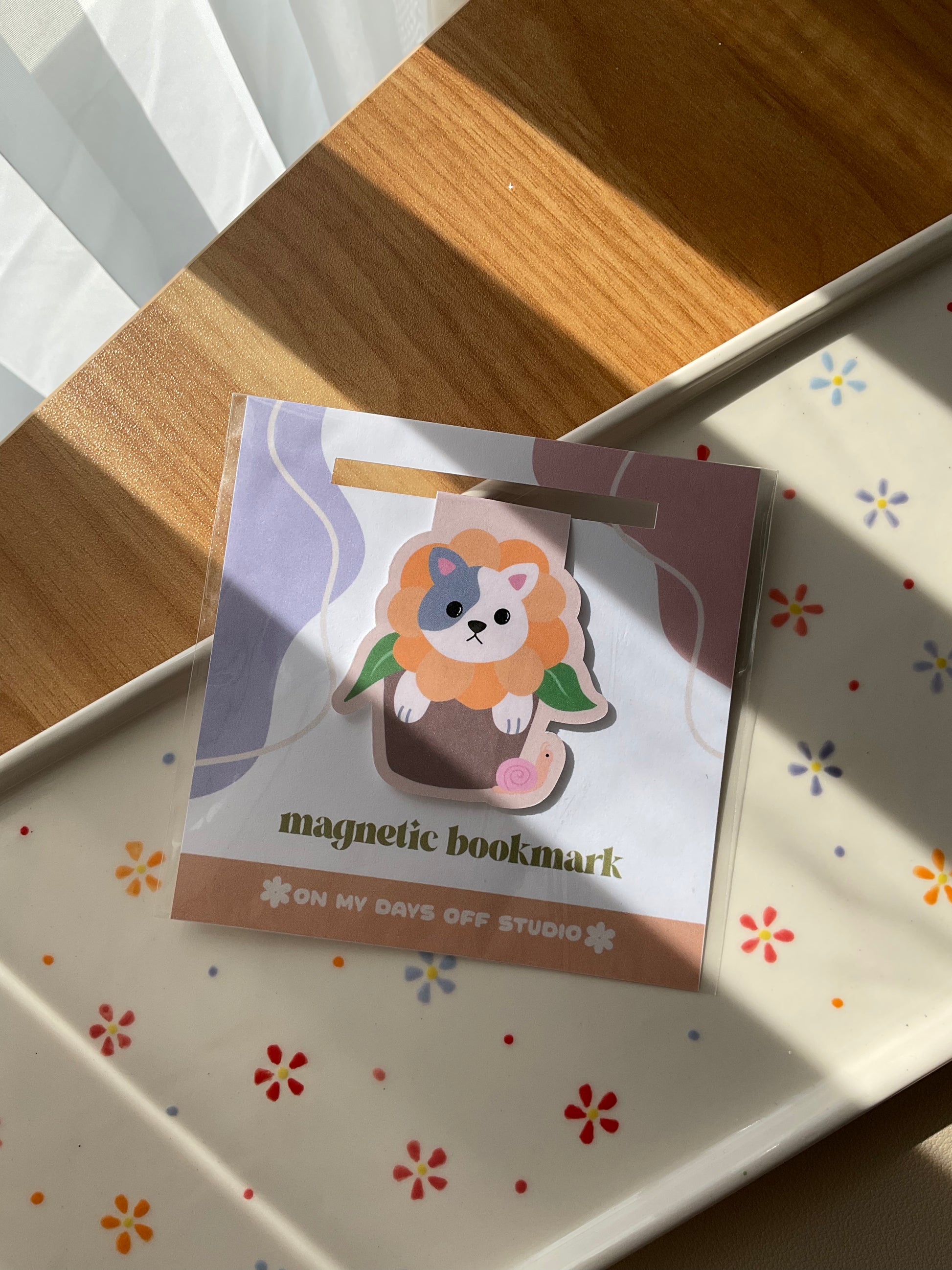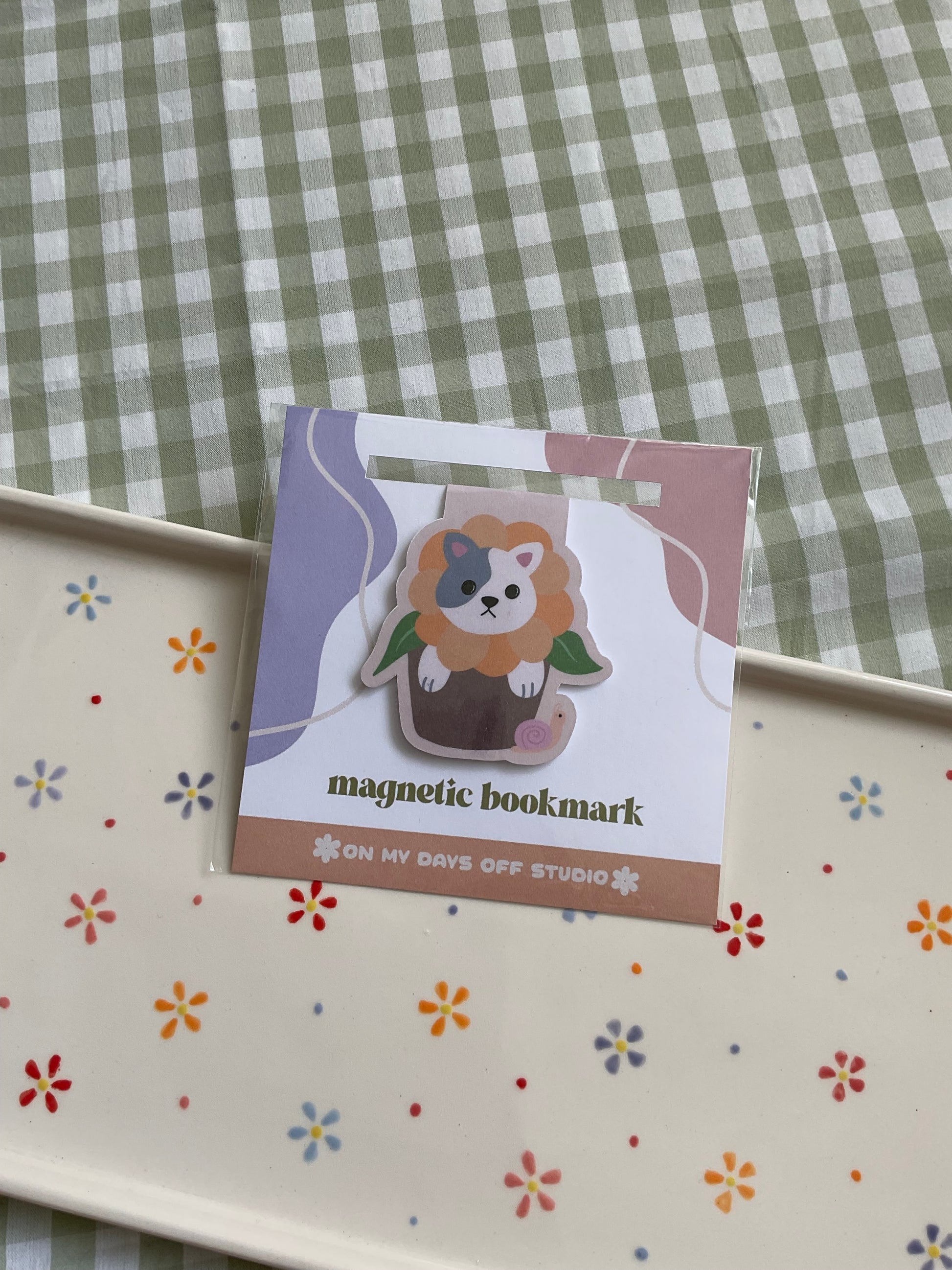 ✿ This cute magnetic bookmark features an cute cat in a sunflower pot.
